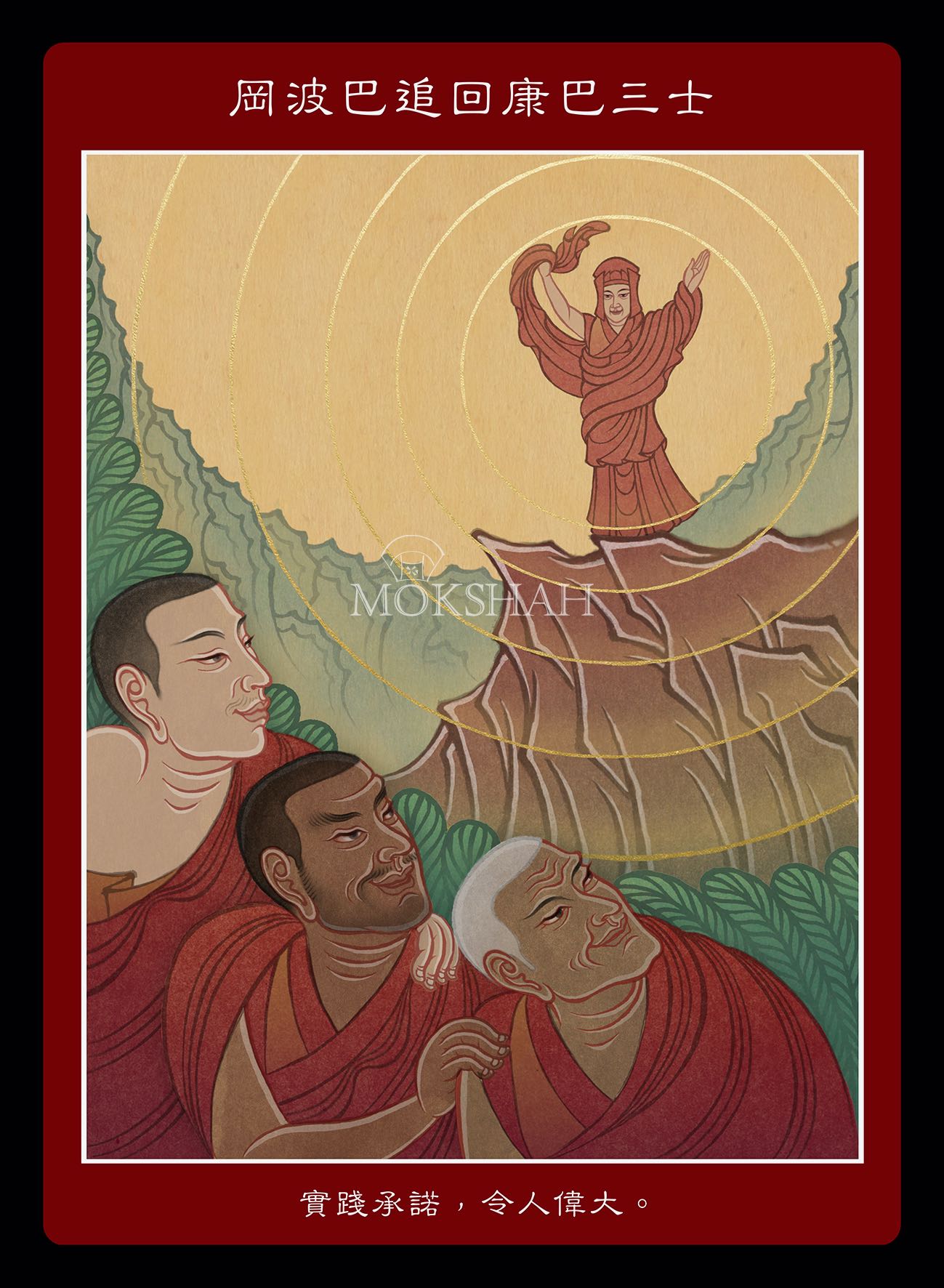 康巴三士要離開寺院時,他們的上師—岡波巴追到附近,招手叫他們回來。