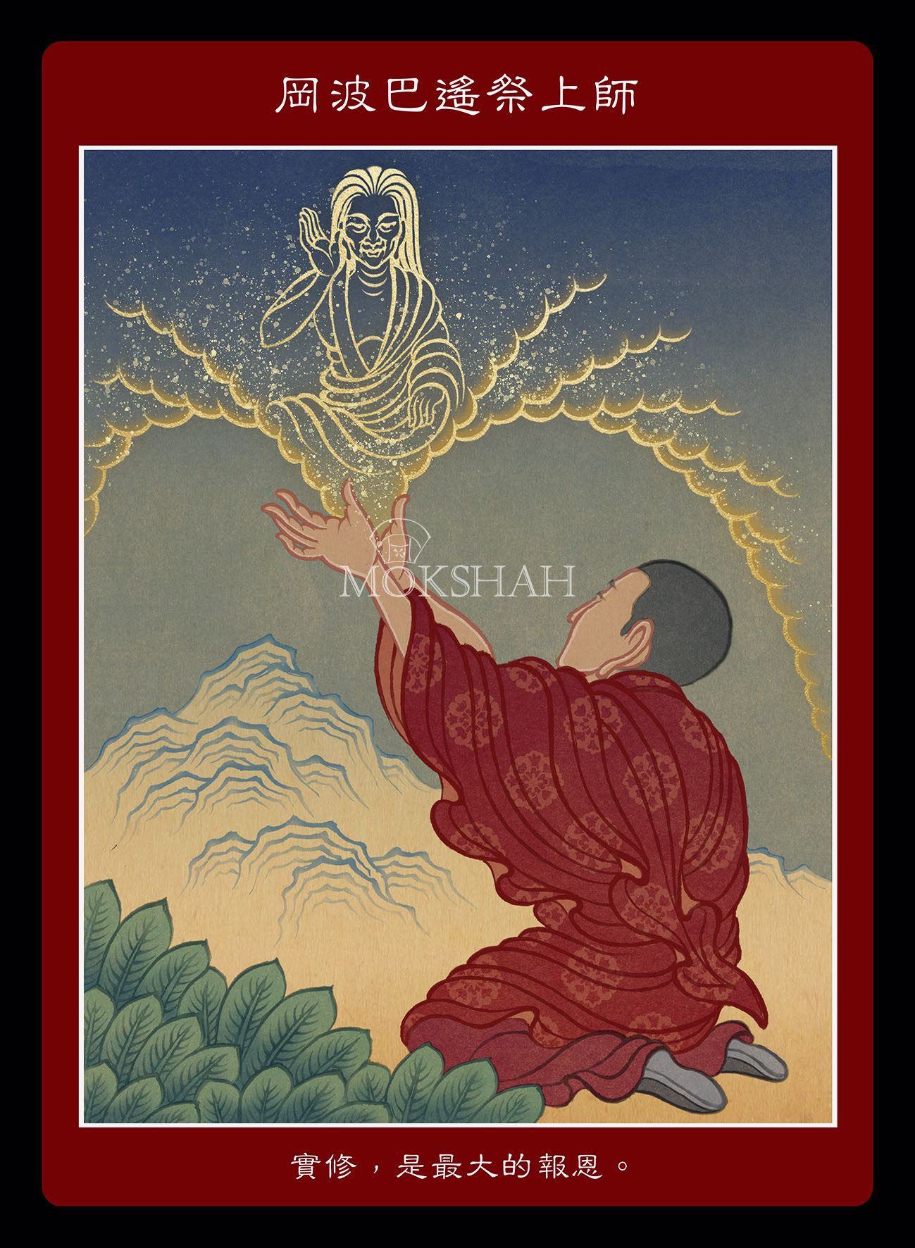 岡波巴聽到他老師過世的消息,悲痛之餘,抓了一把金沙拋到空中奠祭他。