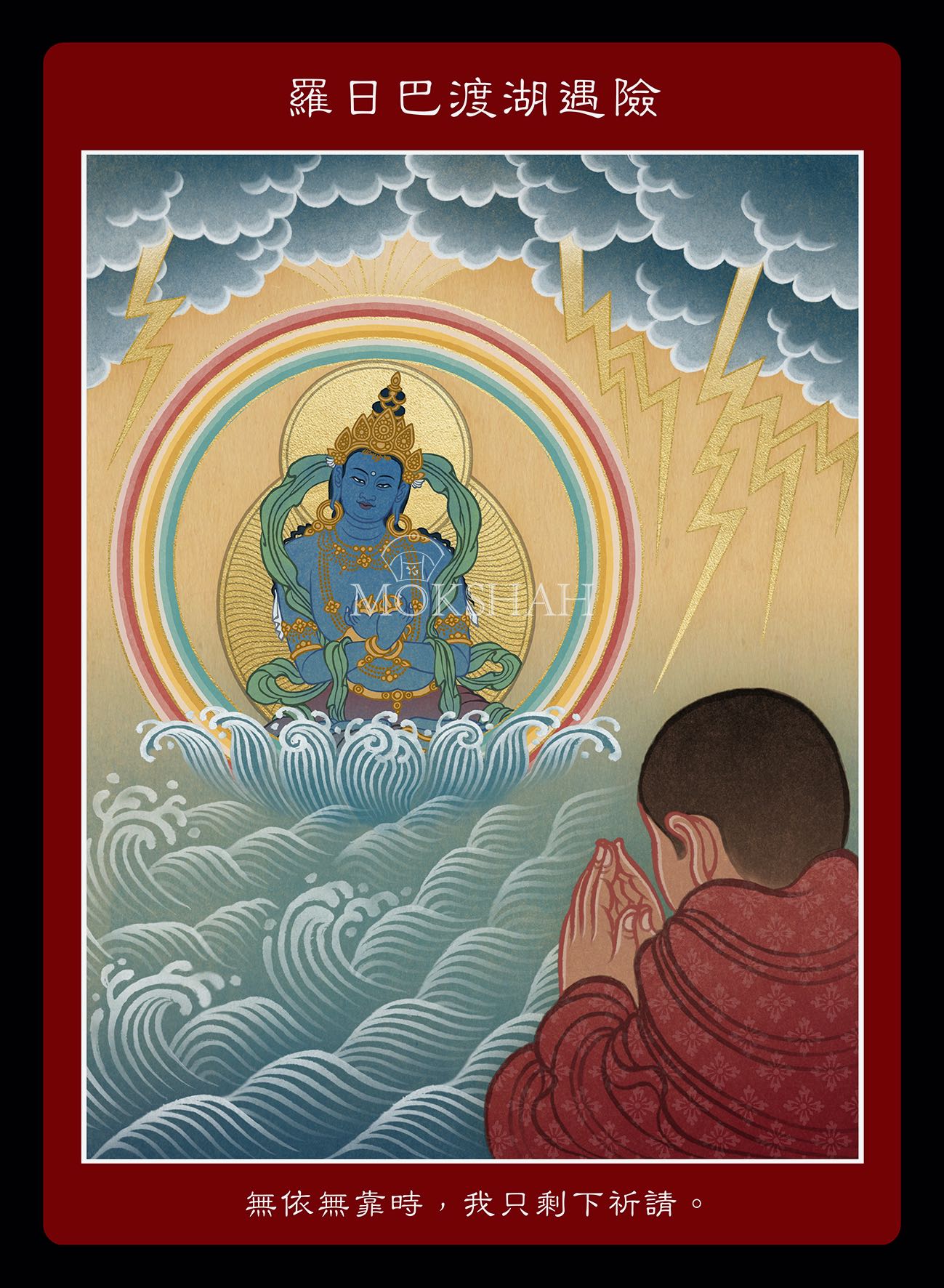 羅氏布衣尊者帶了一袋的麥粉,要前往天湖北方的色摩多島時,正值湖面結冰、漁夫都在村裡休息。 尊者已經下定決心要渡湖上島,但湖水結冰而無法前行,讓他焦急地祈請上師並哭了出來。